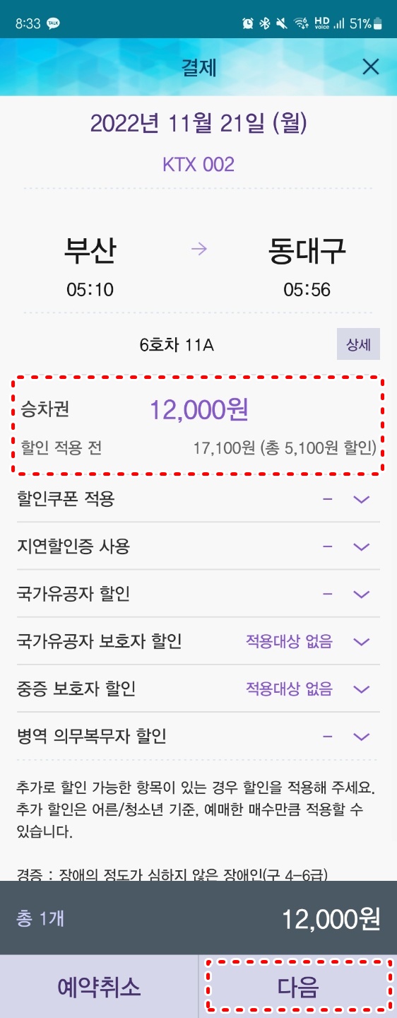 아래와 같이 할인 요금이 표시되면 예약이 잘 된 것입니다(승차권 가격이 할인 전 가격보다 낮게 나옴).