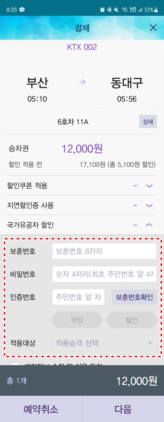 만약 국가유공자에 해당되는 분이 있으시다면 아래 결제 화면에서 국가유공자 할인을 선택하여 보훈번호를 입력하시면 추가할인이 가능합니다(국가유공자 교통지원 50%).