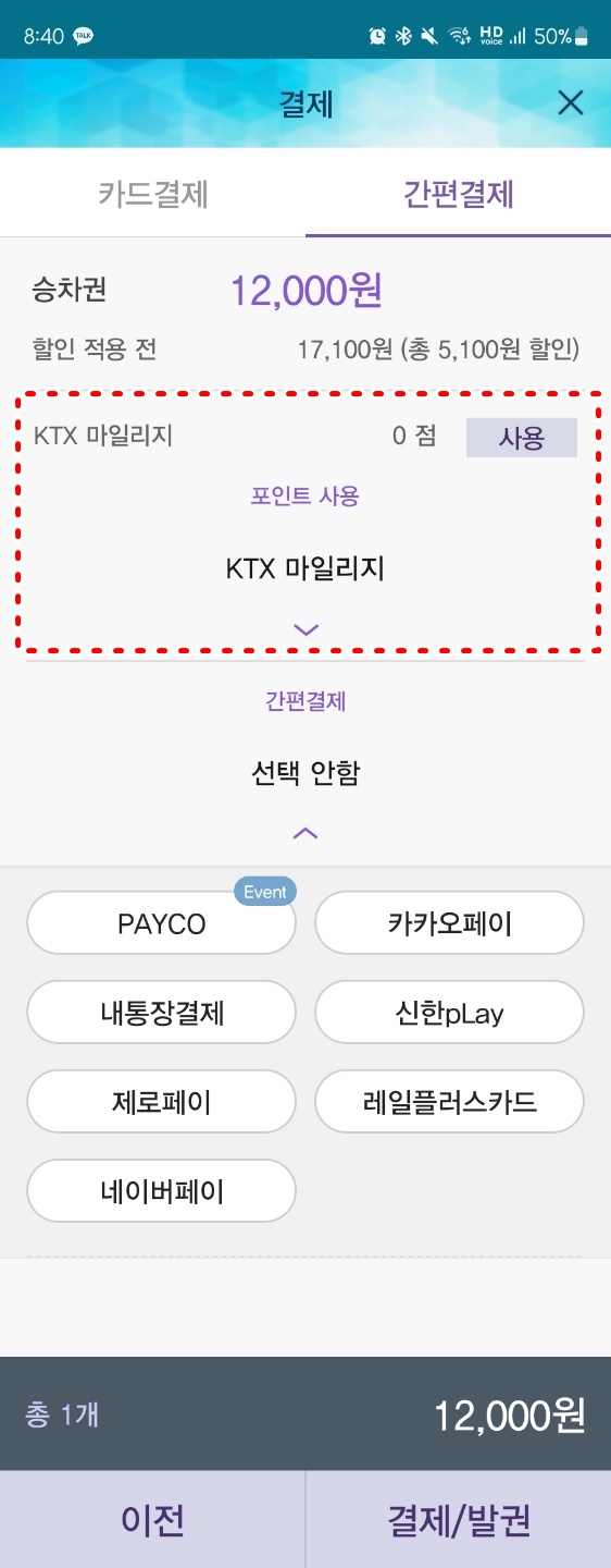 만약 예전에 열차를 이용하여 적립된 마일리지가 있다면 결제 단계 화면에서 이용할 수 있습니다.