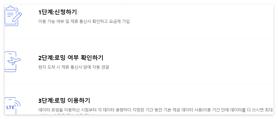 - 맞춤형 로밍 요금제: 사용 중인 휴대폰 정보와 출국 국가명을 입력하여 맞춤형 로밍 요금제 정보 제공