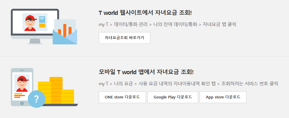 T WORLD웹사이트나 모바일 T WORLD에서 자녀요금을 조회할 수 있는 서비스입니다.
