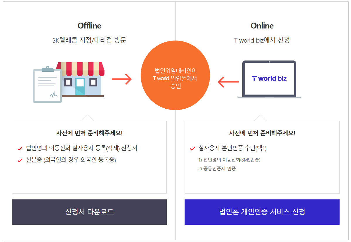 - 서비스 신청: 법인의 위임 대리인이 T world biz를 통해 실사용자를 등록합니다.