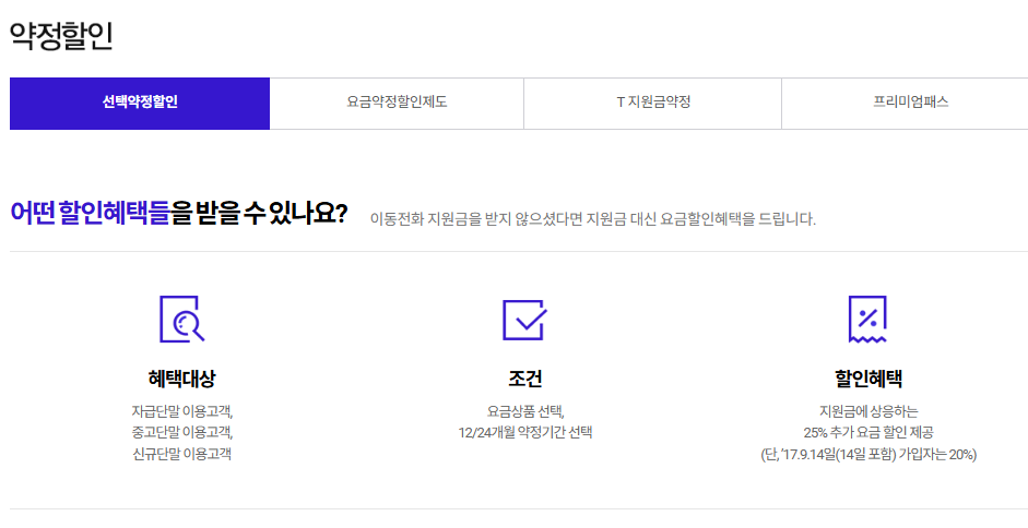 - 휴대폰 개통 시 단말기 공시지원금을 받지 않았다면 선택약정할인 가입이 가능합니다.