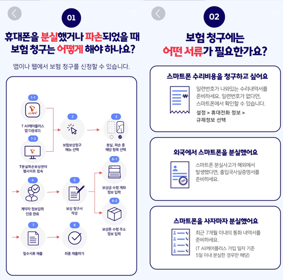 - T 올케어플러스 앱 또는 T 분실파손 보상센터 웹사이트에서 보상 신청.