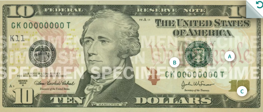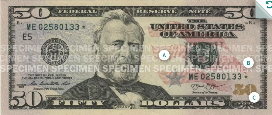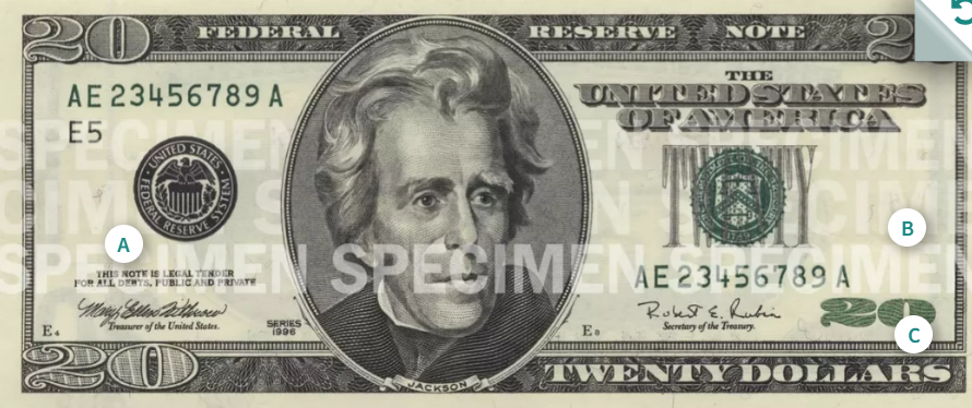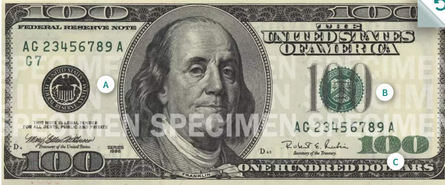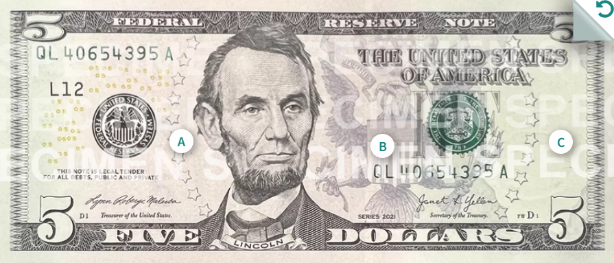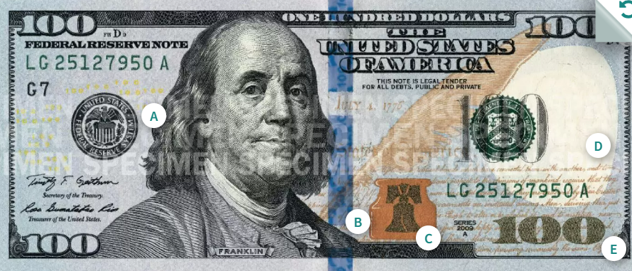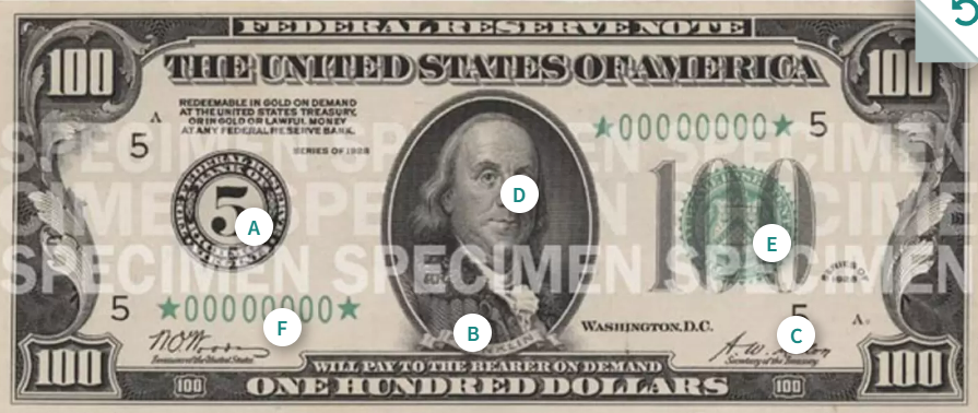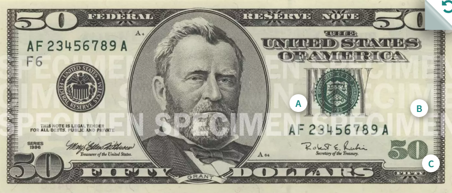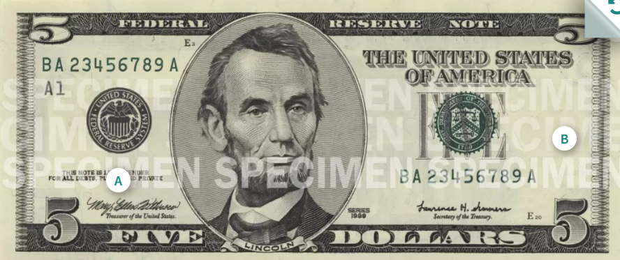 이 중 1달러(조지 워싱턴)와 2달러(토머스 제퍼슨)는 1963년의 도안을 그대로 이용하고 있고 5달러(에이브러햄 링컨)는 2008년 도안, 10달러(알렉산더 해밀턴)은 2006년 도안, 20달러(앤드루 잭슨)는 2003년 도안, 50달러(율리시스 그랜트)는 2004년 도안, 마지막으로 100달러(벤저민 프랭클린)은 가장 최근인 2013년의 도안을 사용하고 있습니다.
