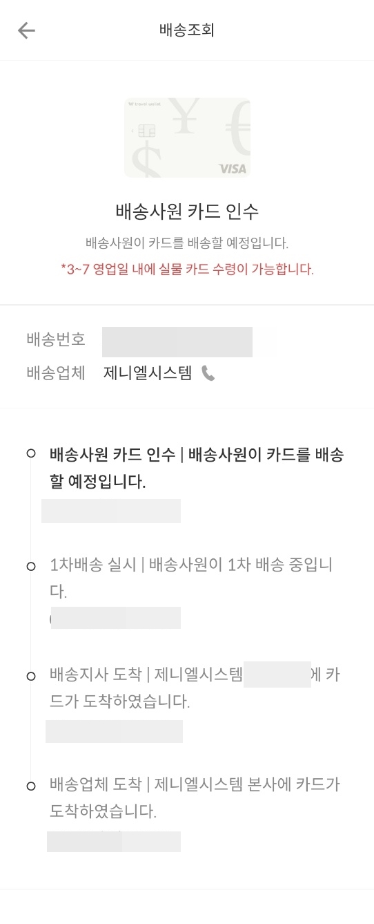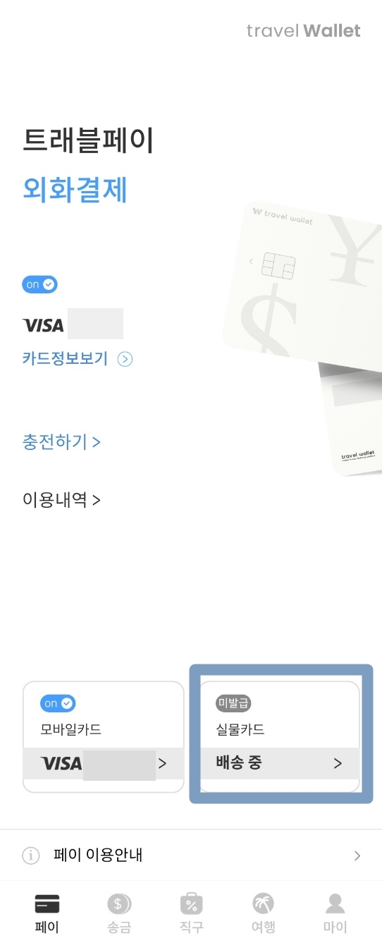 '트래블월렛' 앱을 설치하면 모바일카드는 바로 사용 가능하며, 실물 카드가 필요한 경우에는 앱 내에서 발급 신청을 해야 합니다.