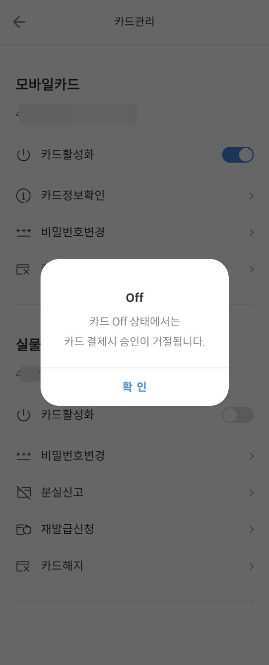 위 절차까지 마치면 실물 카드를 사용할 수 있는 상태가 되며, 본인이 원할 경우 토글 스위치(파란색 동그란 버튼)를 꺼서 즉시 비활성화 시킬 수 있습니다.